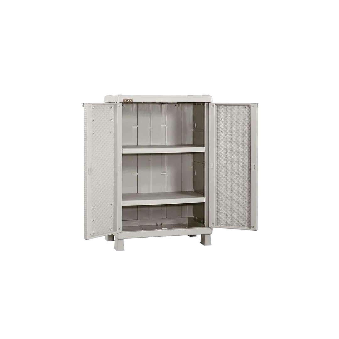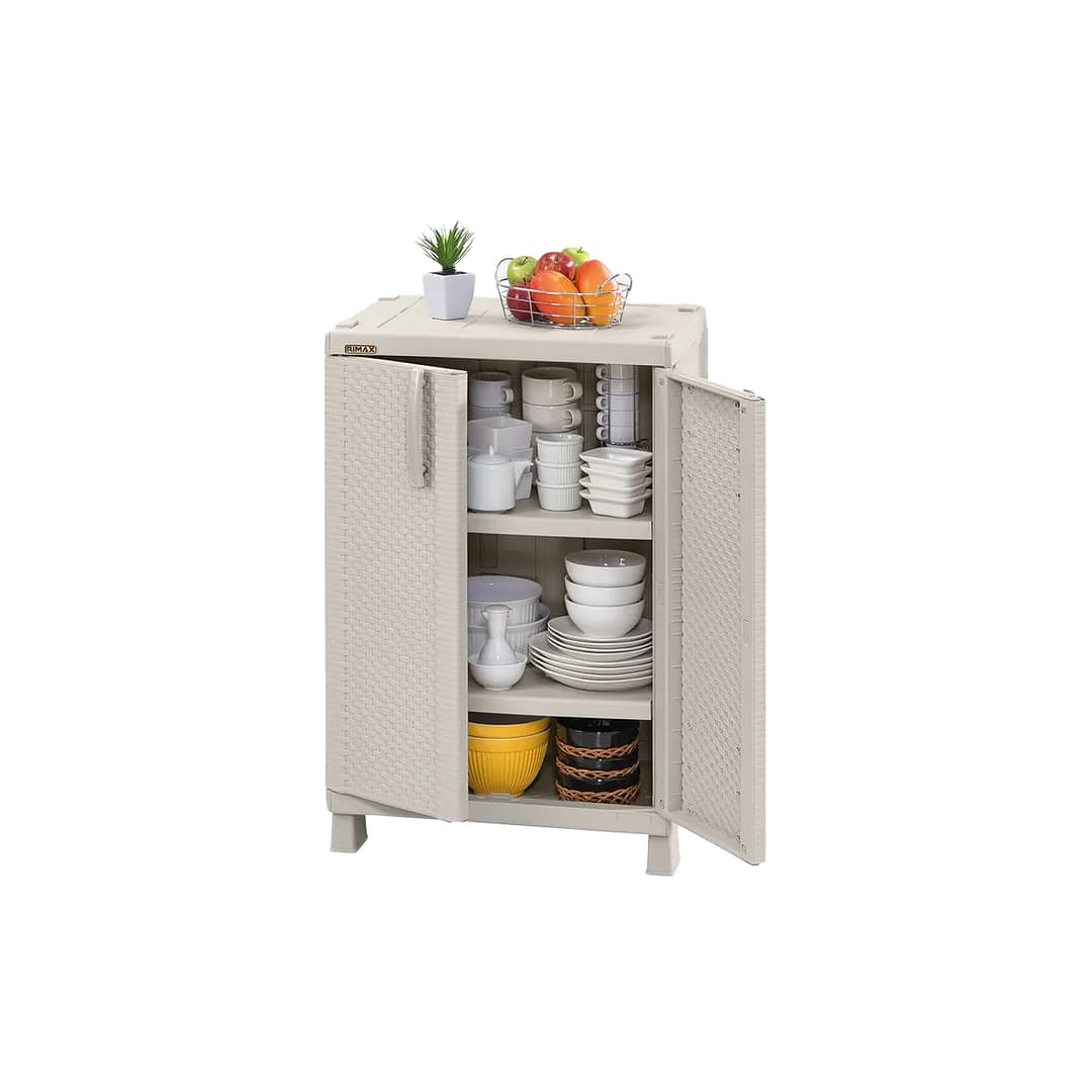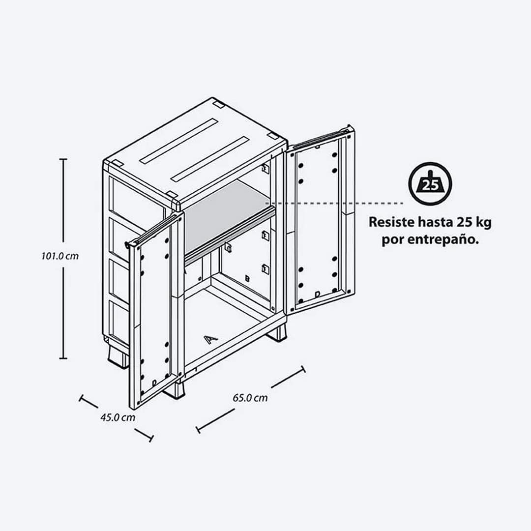 Armario Mediano con textura Rattan, con 2 entrepaños ajustables que resisten hasta 25 Kg cada uno. Fácil de armar, mover y limpiar. Con la resistencia y beneficios del plástico. Excelente capacidad interior, con orificio para uso de candado para mayor seguridad. Apariencia artesanal y elegante que acompaña tus espacios de la mejor manera.