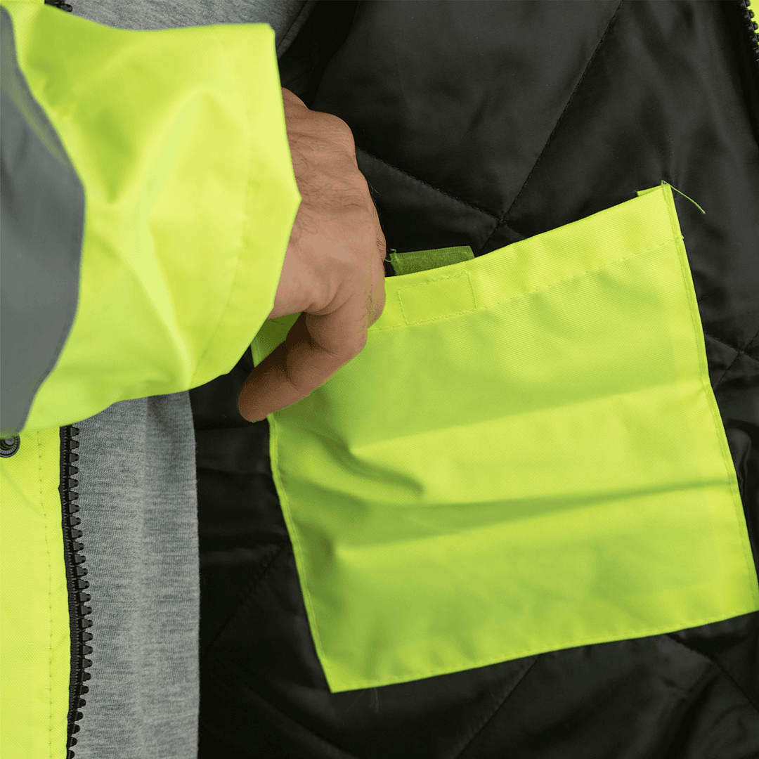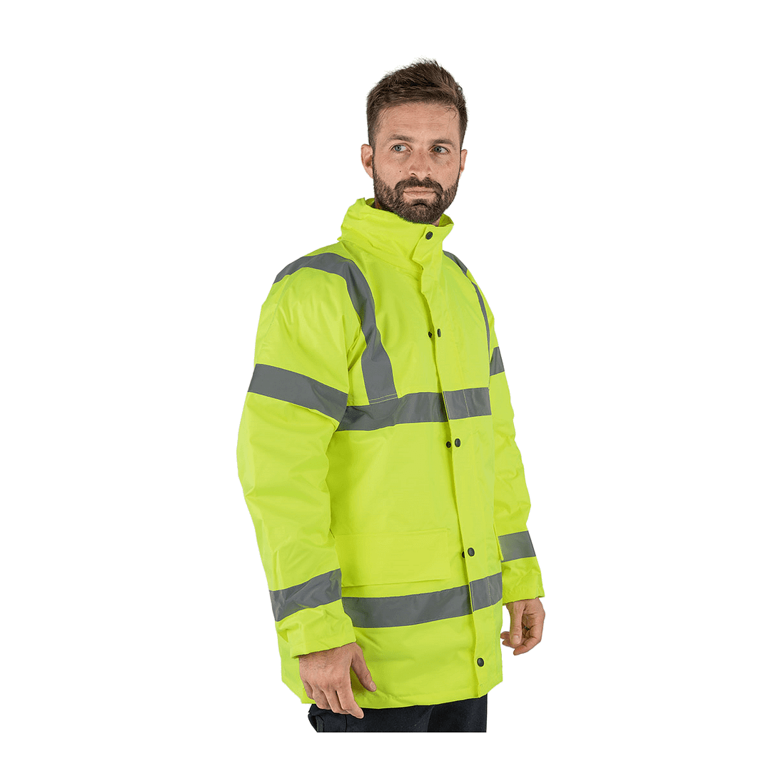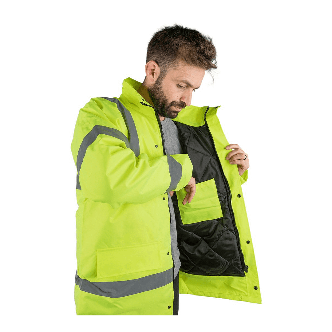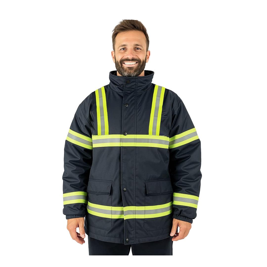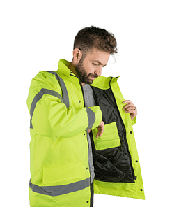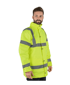 Campera ideal para el frio y de alta visibilidad. Confeccionada con tela impermeable, con forro capitoneado y guata. Cinta reflectiva gris de 5 cm. Doble cinta en contorno del cuerpo, en forma vertical (delantero-hombro-espalda) una a cada lado del cuello y doble cinta en cada manga.