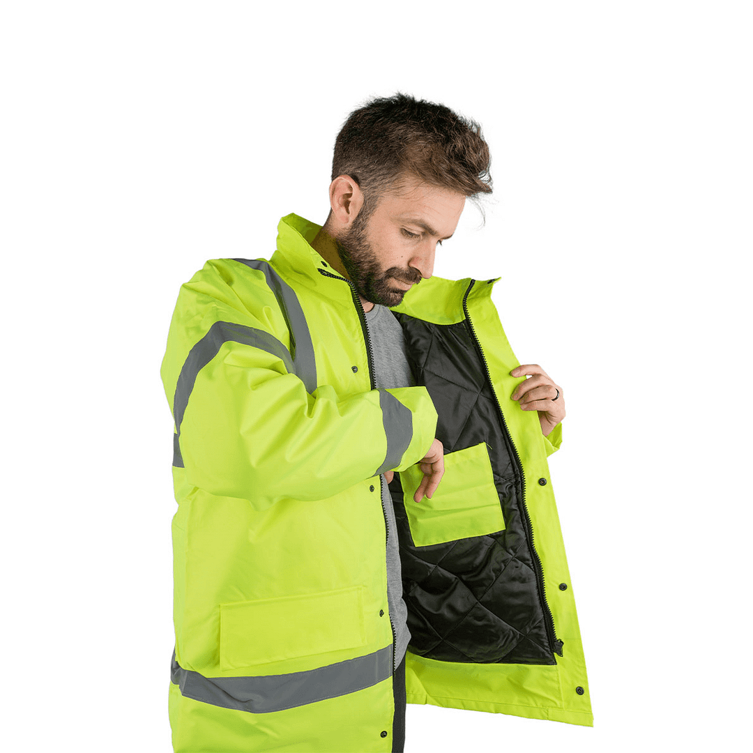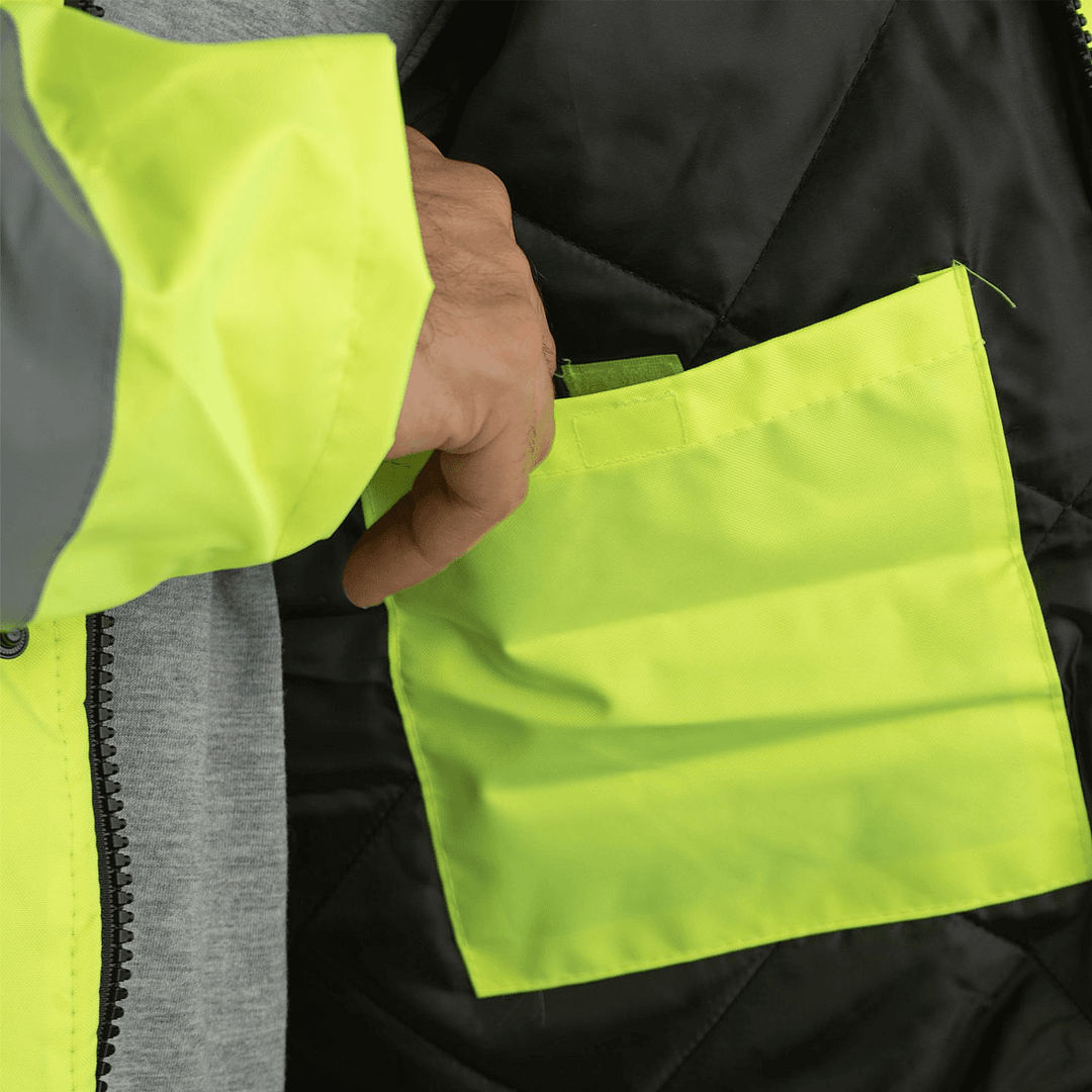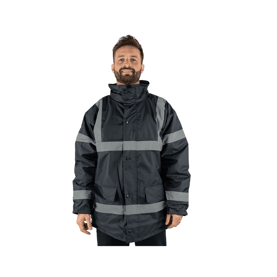 Campera ideal para el frio y de alta visibilidad. Confeccionada con tela impermeable, con forro capitoneado y guata. Cinta reflectiva gris de 5 cm. Doble cinta en contorno del cuerpo, en forma vertical (delantero-hombro-espalda) una a cada lado del cuello y doble cinta en cada manga.