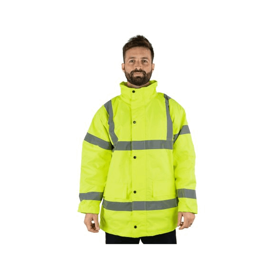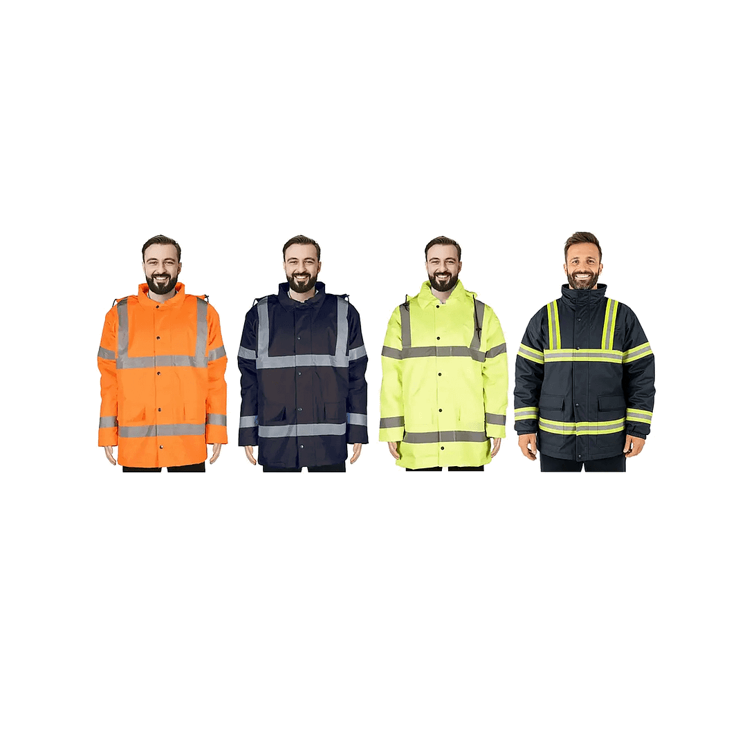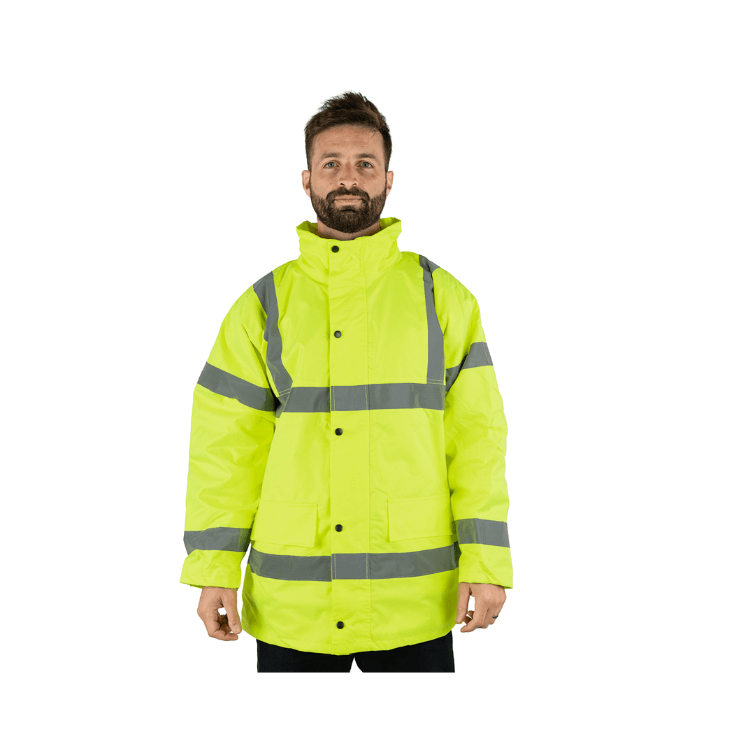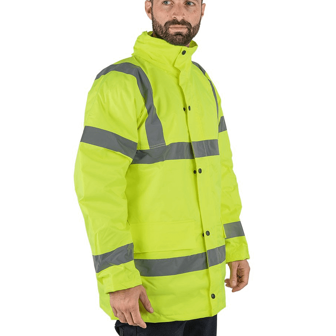 Campera ideal para el frio y de alta visibilidad. Confeccionada con tela impermeable, con forro capitoneado y guata. Cinta reflectiva gris de 5 cm. Doble cinta en contorno del cuerpo, en forma vertical (delantero-hombro-espalda) una a cada lado del cuello y doble cinta en cada manga.