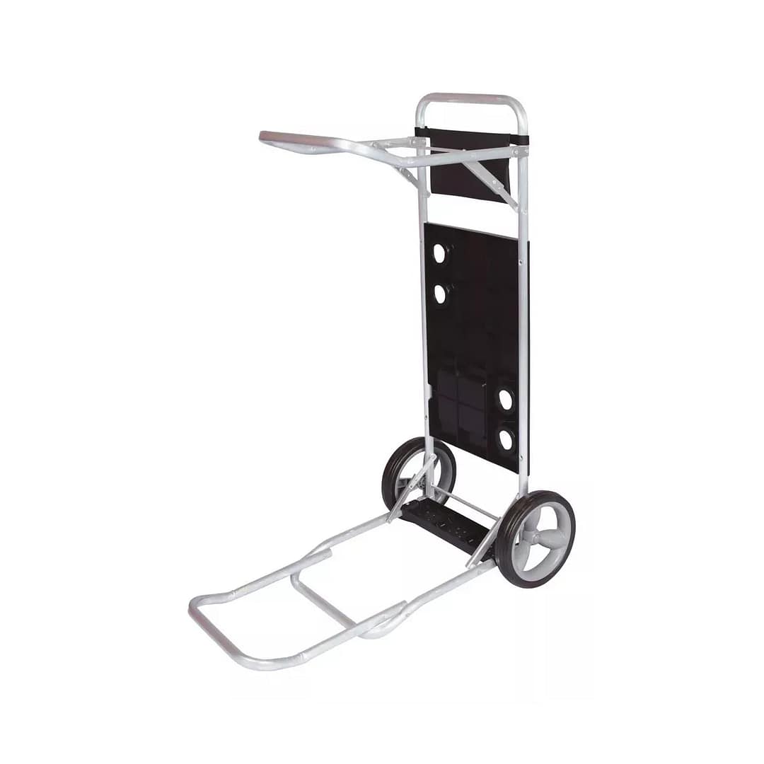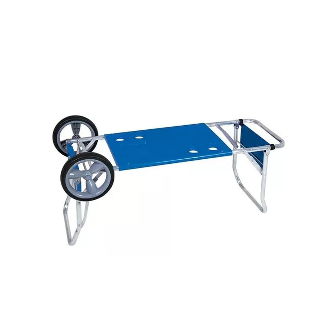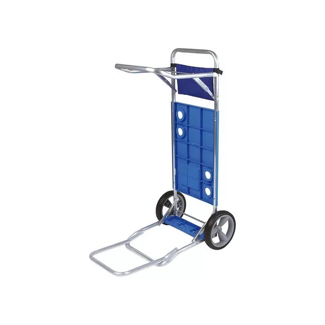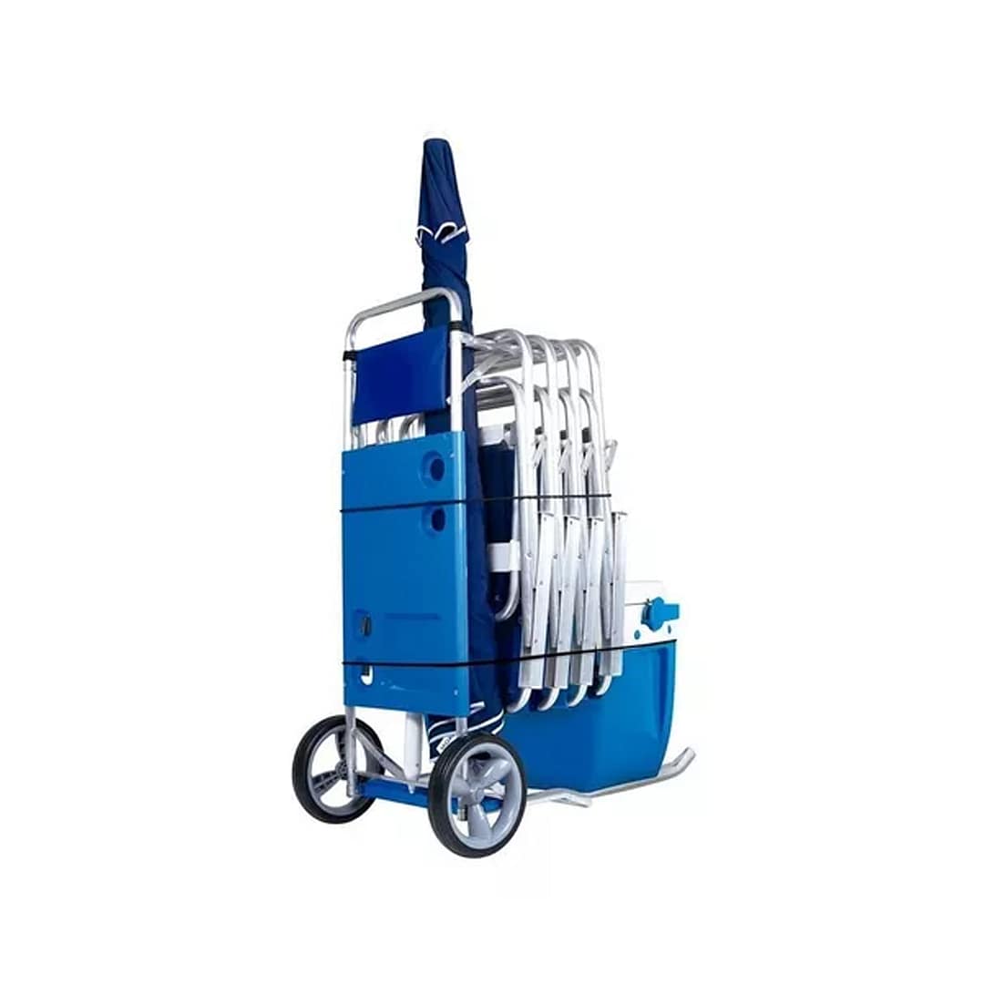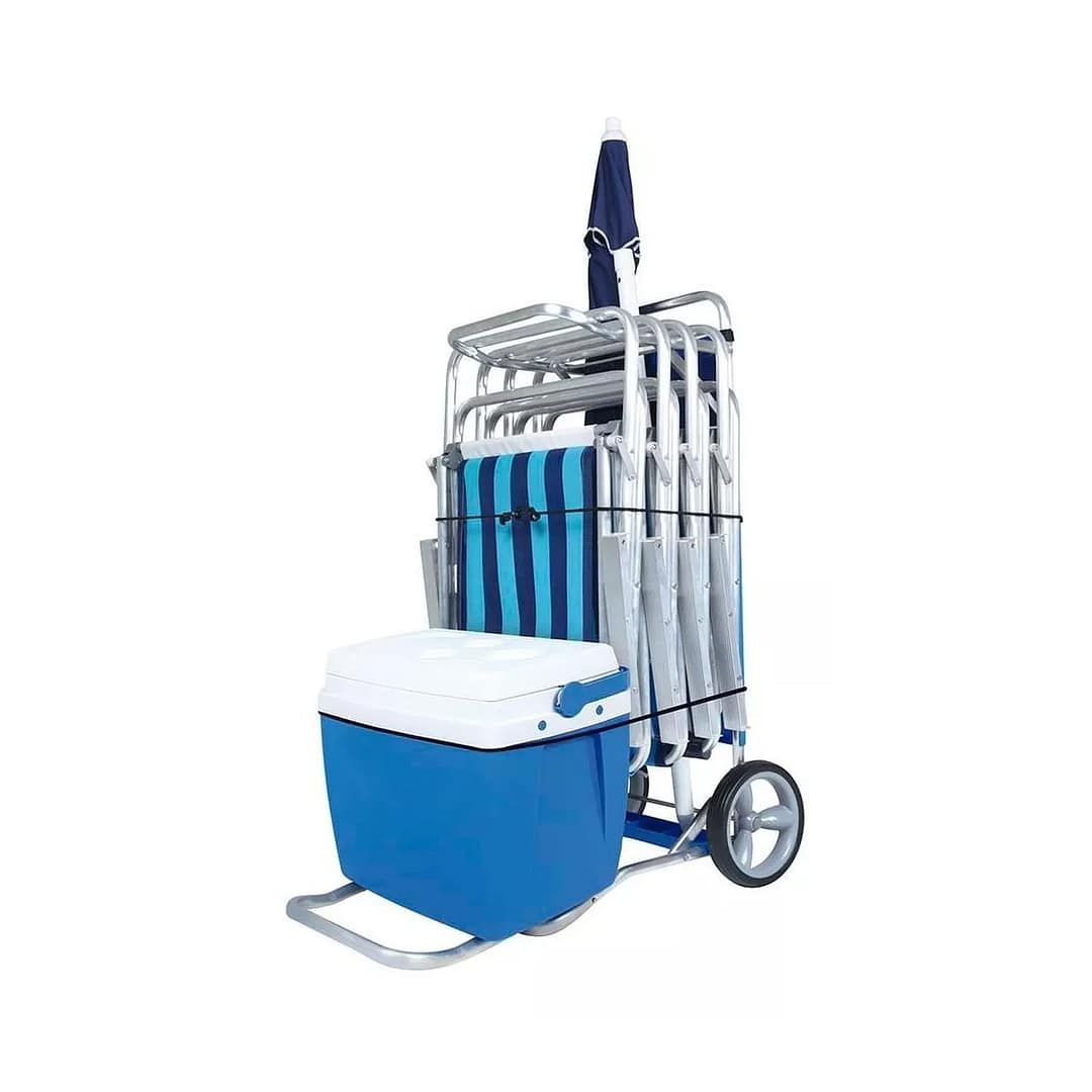 El carrito se transforma en una practica mesa con 4 soportes para vasos o latas. Diseñado para soportar hasta 5 sillas y una conservadora sin problemas ya que su diseño trae una extensión para poder transportar sin problemas sus pertenencias, gracias a su estructura en aluminio de alta calidad, trae porta sombrillas o esteras, esta perfectamente diseñado pata que disfrutes un día entero en la playa. Además trae un sobre en para que puedas guardar todas tus pertenencias en el sus ruedas son grandes y de material de alta calidad para garantizar su buen desempeño y alta durabilidad.